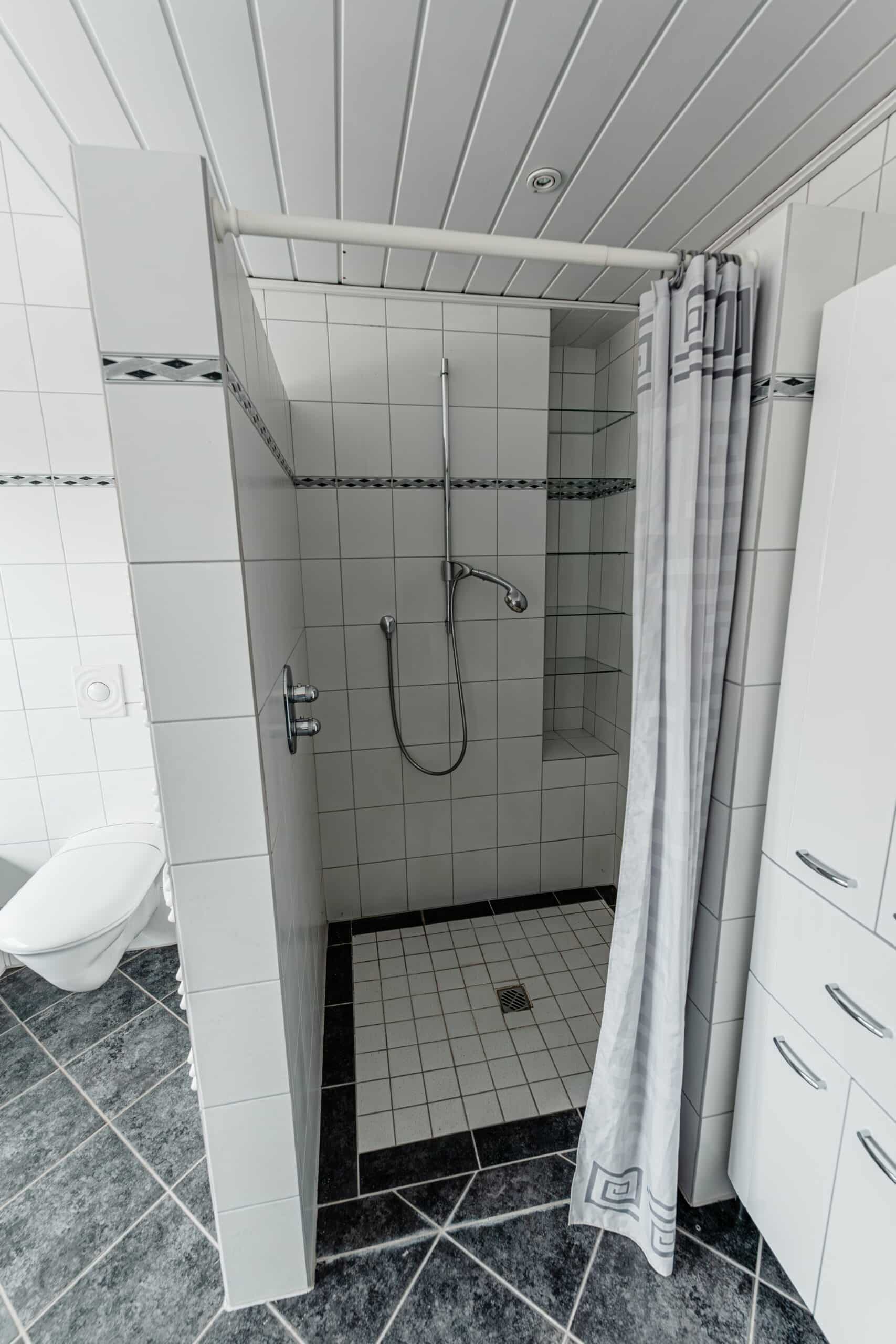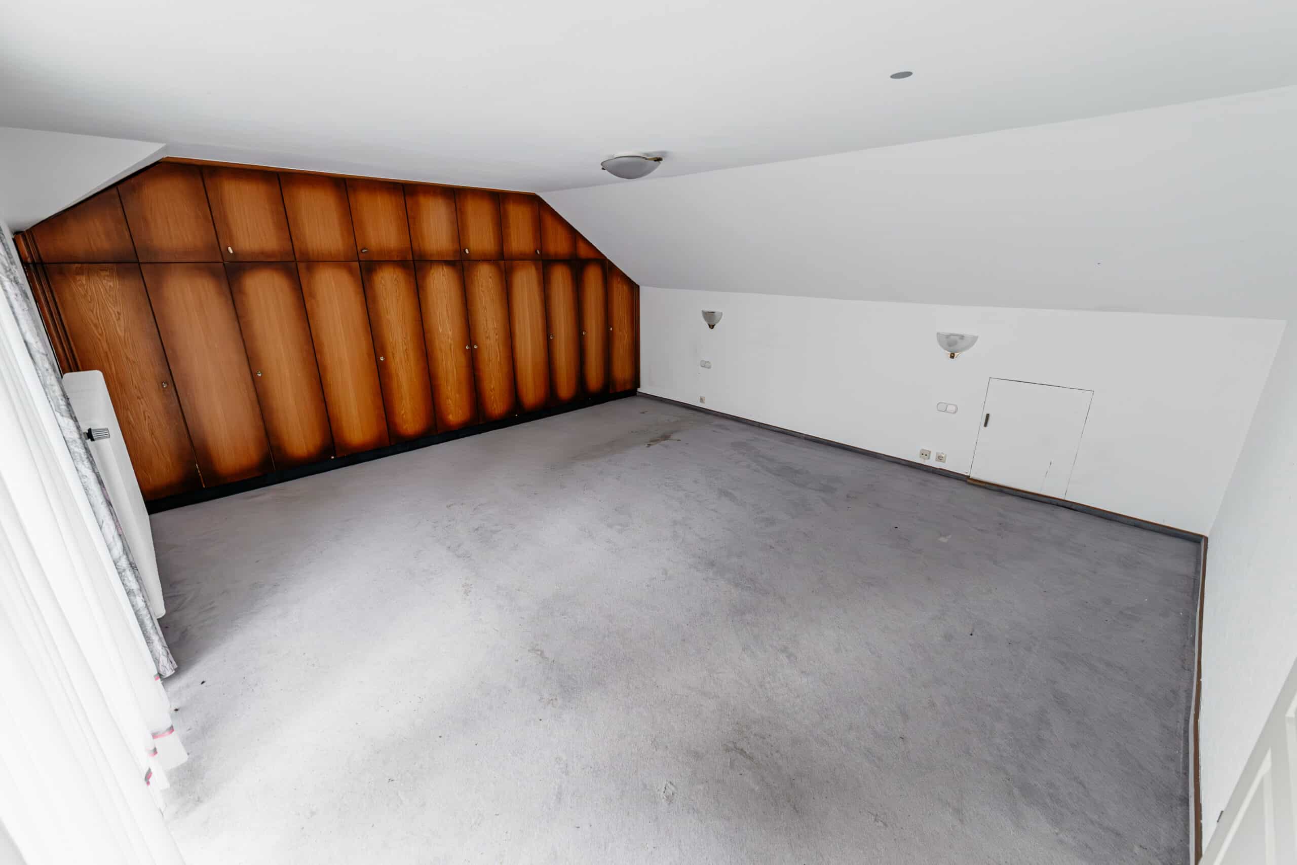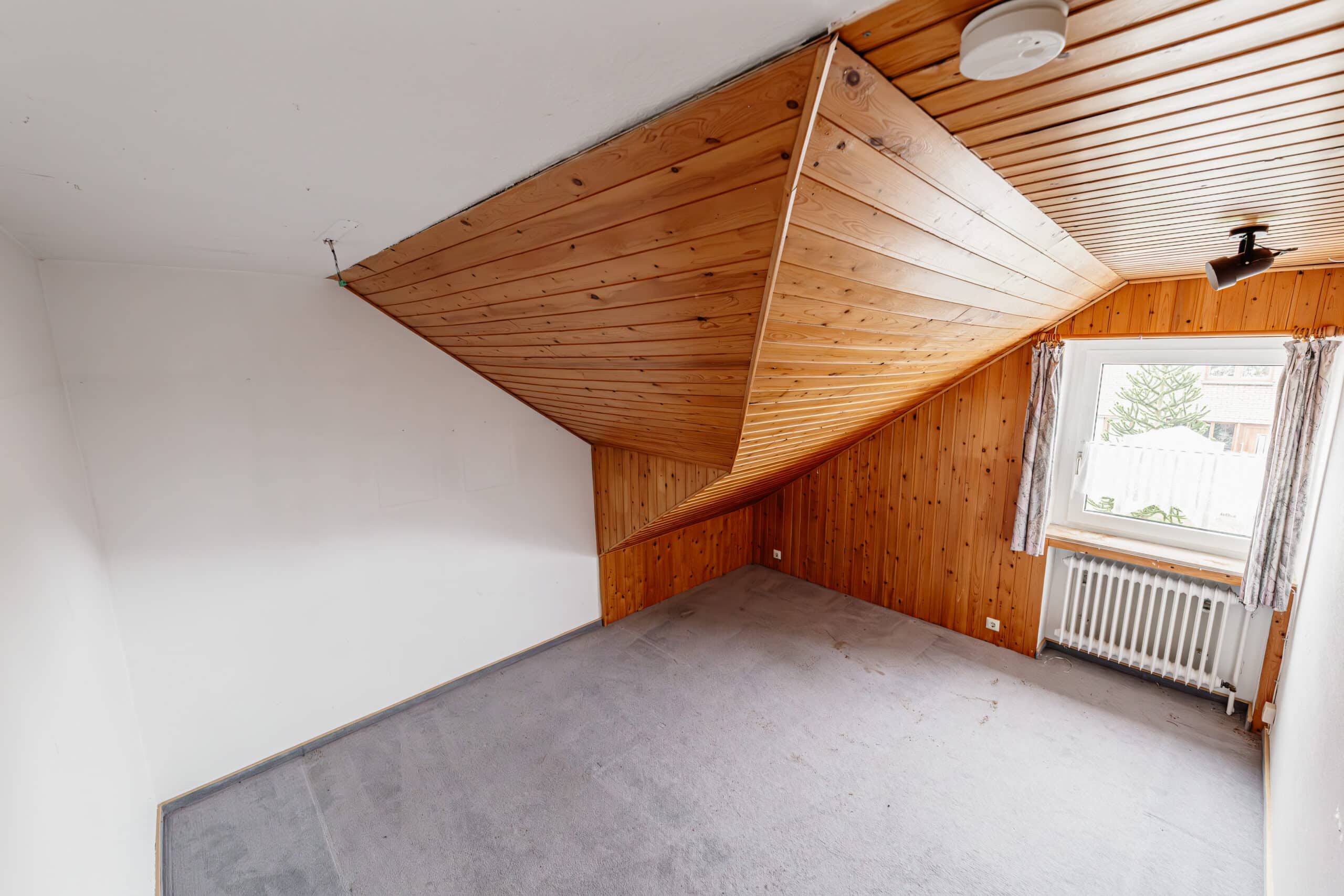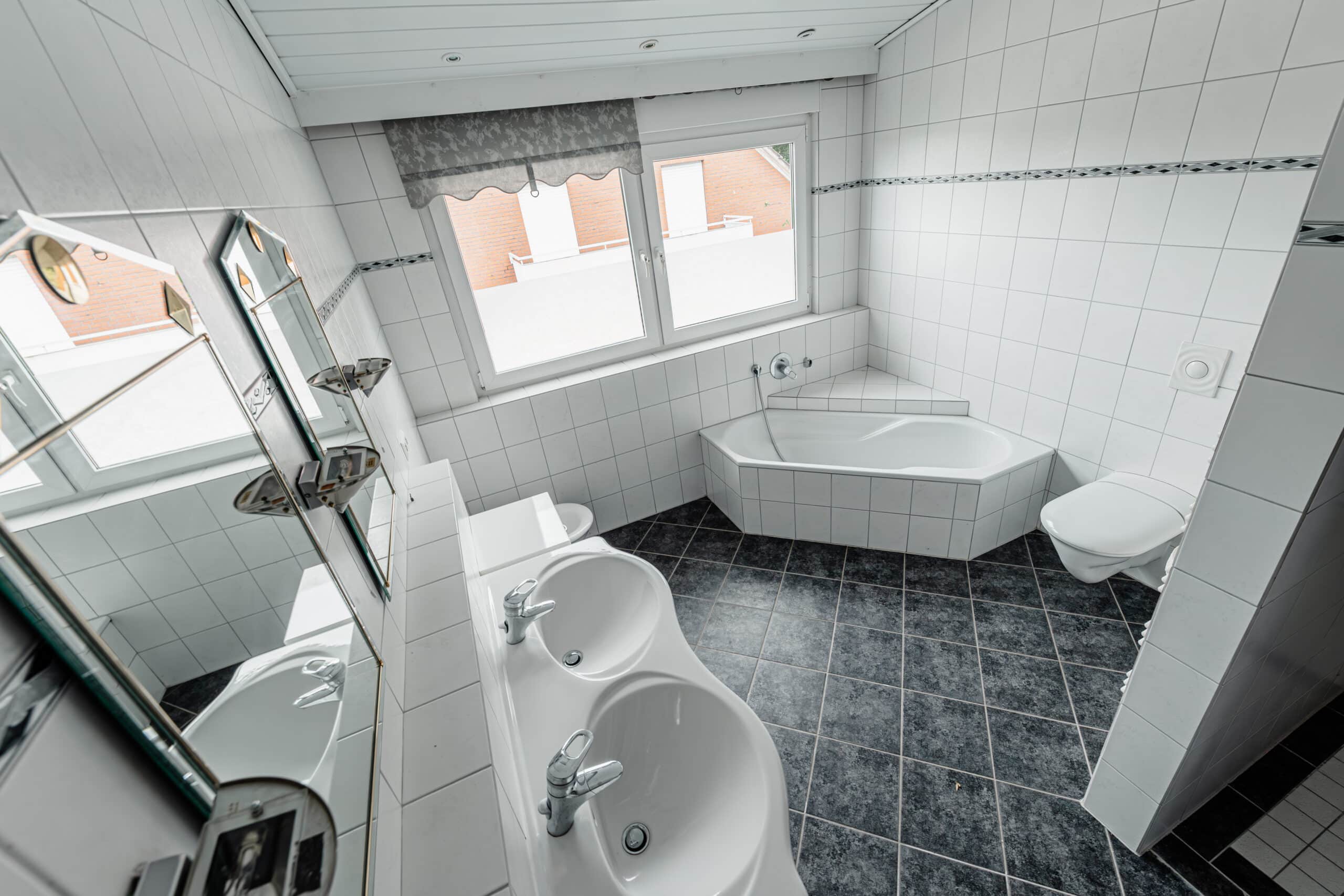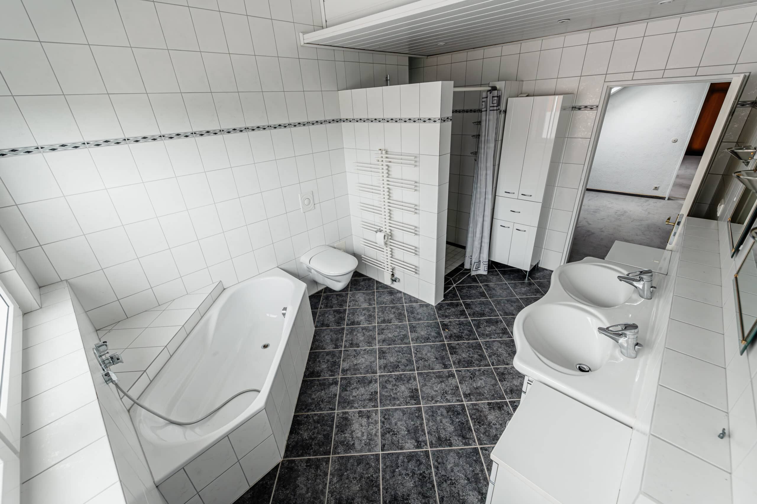 Im Obergeschoss erwartet Sie ein großes Schlafzimmer mit eigenem Balkonzugang, wo Sie die Ruhe genießen und die Natur betrachten können. Das Badezimmer bietet alles, was das Herz begehrt: eine Badewanne, eine barrierefreie Dusche, Fußbodenheizung, einen Handtuchheizkörper und ein Doppelwaschbecken. Zwei weitere individuell nutzbare Schlafzimmer runden das Obergeschoss ab.